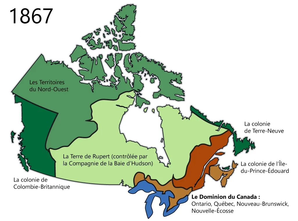 Le Dominion du Canada comprenait le sud de l’Ontario, le sud et l’est du Québec, le Nouveau-Brunswick et la Nouvelle-Écosse. La colonie de l’île-du-Prince-Édouard comprenait la même province qu’aujourd’hui.